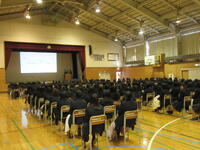 修了式では、この1年間の成果について振り返るとともに、今日から新年度に向けた準備をすすめてほしいと校長より話がありました。また、離任式では、校長より離任者の紹介の後、離任者からの挨拶をいただきました。離任者には、生徒を代表して生徒会執行部より花束が贈られました。