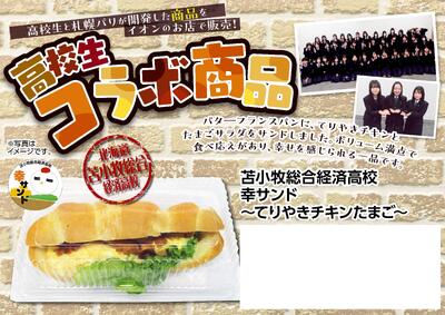2学年が開発した「幸(さち)サンド」は、苫小牧市の食育推進計画に関するデータをもとに、若い世代の朝食改善を目指して開発した「てりやきチキンたまごサンド」です。朝が苦手な方でも手軽に食べられ、しっかりと栄養をとることができる商品に仕上がりました。