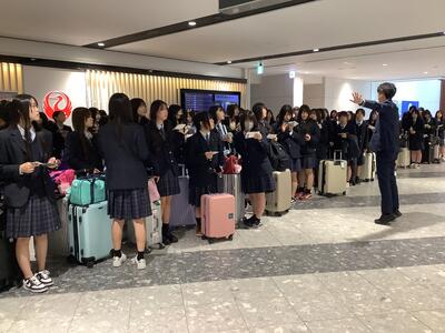 初めての海外に緊張の面持ちで集まった派遣生徒8名。いずれも国際経済科の1年生で、海外(特に韓国)に興味・関心の強い生徒が選抜されました。お見送りに来ていただいた保護者へ研修ツアーへの意気込みを伝え、いざ憧れの韓国に向けて出発です。